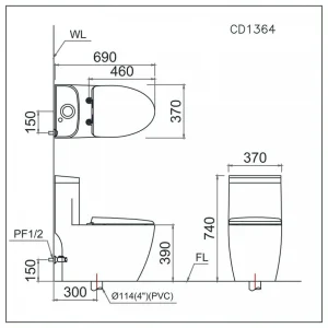 - Kích thước bồn cầu CD1364 (không nắp) : 690 x 370 x 740mm (DxRxC)