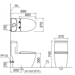 - Kích thước bồn cầu CD1364 (không nắp) : 690 x 370 x 740mm (DxRxC)