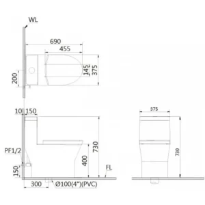 Bản vẽ kích thước bàn cầu Caesar CD1374+TAF060