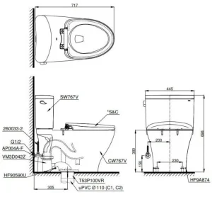 Bản vẽ kích thước bồn cầu điện tử TOTO CS767W18