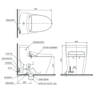 Bản vẽ kích thước bồn cầu điện tử TOTO MS636W23