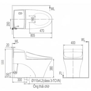 - Kích thước bồn cầu: 805 x 400 x 588 mm (dài x rộng x cao)