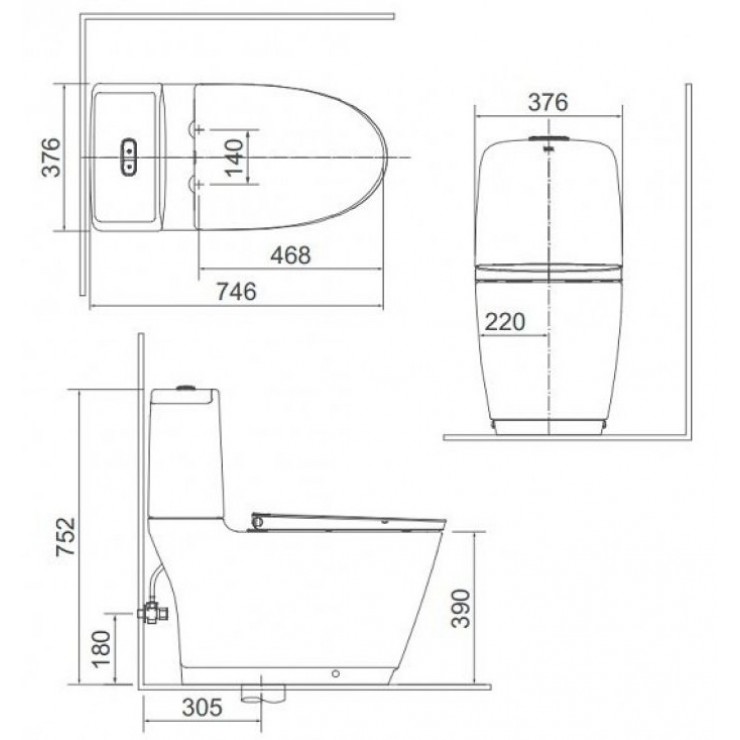 - Kích thước bồn cầu: 746x376x752 mm (DxRxC)