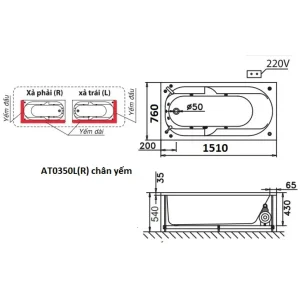 AT0350L bồn tắm xả trái, yếm phải