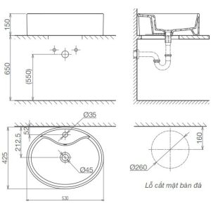 Bản vẽ kỹ thuật chậu rửa mặt CD 19 Viglacera