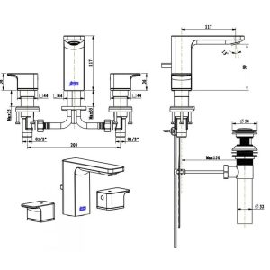 Bản vẽ kích thước vòi chậu rửa mặt American WF1303WS 3 lỗ